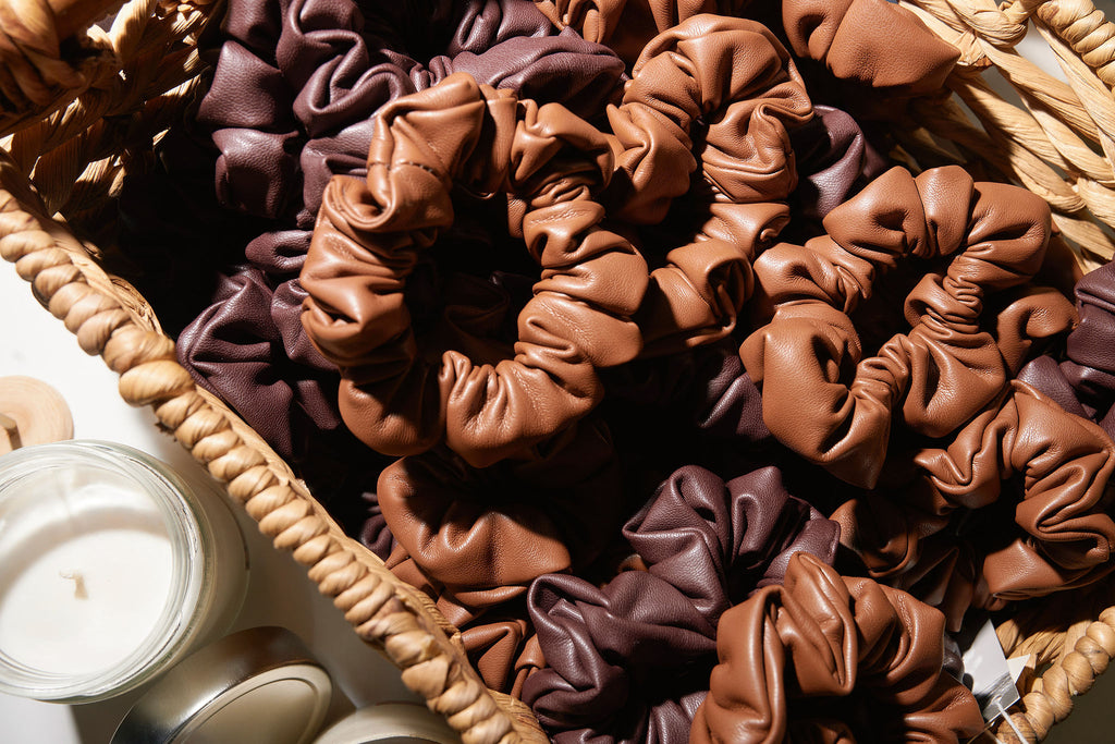 Our vegan leather scrunchies combine sleek, polished style with soft flexibility. Bold yet practical, they hold securely while adding a unique, fashion-forward edge to any look.